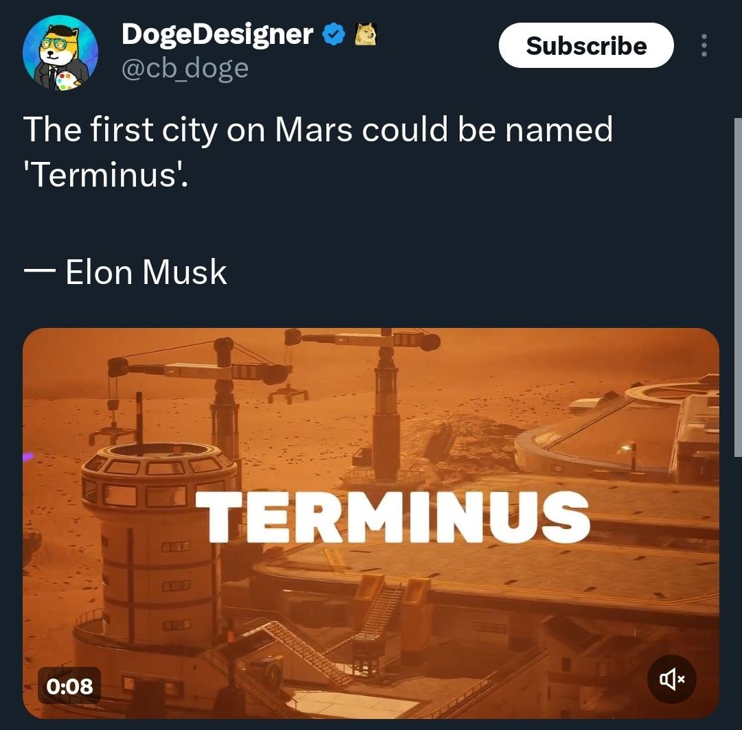 8 сентября 2024 года анонимный трейдер инвестировал $135 в мемкоин TERMINUS. Всего через две недели, 20 сентября, в социальной сети X на странице DogeDesigner появился пост с заявлением, приписываемым Илону Маску: «первый город на Марсе будет носить имя Terminus». Это вызвало резкий рост цены токена.