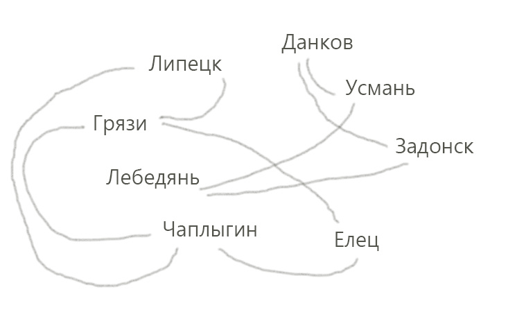 В Липецкой области существуют дороги между следующими парами городов: Липецк–Грязи, Данков–Усмань, Задонск–Данков, Грязи–Елец, Усмань–Лебедянь, Чаплыгин–Грязи, Лебедянь–Задонск, Чаплыгин–Елец, Липецк–Чаплыгин. До каких городов области можно добраться из Липецка (возможно, с пересадками)? По рисунку видно, что из Липецка можно доехать в Грязи, из Грязи в Елец и Чаплыгин, но последнее необязательно, потому что в Чаплыгин из Липецка есть прямая дорога. Ответ: Грязи, Елец, Чаплыгин. Остальные задачи раздела