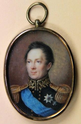 Однако давайте поизучаем еще другие детали, имеющиеся на портрете. Отметим очевидно нерусские эполеты с рисунком на поле. В принципе эту деталь не стоит воспринимать как однозначное свидетельство того, что персонаж портрета изображен не в русском мундире - в период и сразу после окончания наполеоновских войн такие эполеты встречаются на портретах русских офицеров и генералов, в ходе походов 1813-14 гг. побывавших за рубежом и приобретших этот элемент униформы, видимо, во Франции. Больше меня смутил воротник. Он хоть и имеет золотое шитье в виде дубовых листьев, каковое полагалось на русских общегенеральских мундирах, но при этом не красный, а зеленый, и , кроме того, наглухо застегнут на крючки. Зеленые мундиры с золотым шитьем из дубовых листьев полагались русским адмиралам. Но и в их случае они на крючки не застегивались.