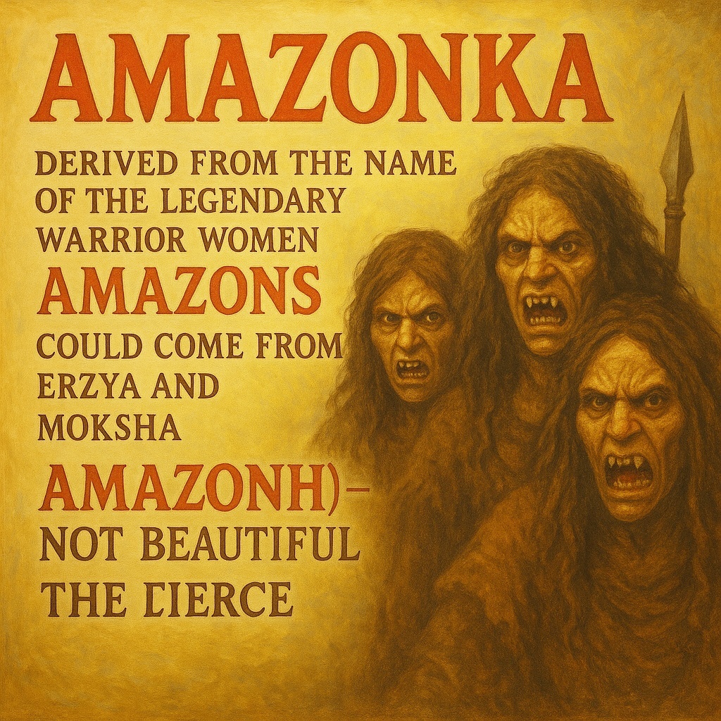 Самая большая река Амазонка происходит от наименования легендарного воинственного женского племени Амазонки, которые по многим сведениям обитали в районе реки Дон, и вероятно соседствовали с другими племенами, говорившими на родственных языках финских народов, например Мещера говорили на языках мордвы(Мокша,Эрзя). Слово Амазонка могло произойти от эрзянского и мокшанского языков от Амазонь(Афмазонь)- Некрасивая(Непринадлежащая Красоте), где А(Аф)-Не, Мызы-Красивая(ая,ое,ые), Нь- окончание обозначающая принадлежность к чему-либо, т.е. Амазонка -Некрасивая(ая,ое) или Страшная, Устрашающая, что вполне укладывается в легенду об Амазонках, ибо одним своим видом могли внушать страх. P.S. Также Amazon- одна из самых крупных компаний в мире.