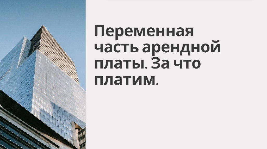 Помимо арендной платы за пользование помещением стороны вправе установить арендную плату за обеспечение помещения коммунальными ресурсами, эксплуатационными и иными услугами. Состав такой аренды определяется сторонами при заключении договора, какие-то расходы собственника компенсируются арендатором (переменная часть), часть расходов может оставаться на собственнике и не включаться в арендную плату. Состав переменной части. Предлагаю рассмотреть определенный перечень возможных вариантов переменной арендной платы. Указанный перечень не является закрытым, это лишь некий ориентир. Возможны его различные варианты и сочетания. 1)Коммунальные платежи Платежи, направленные на обеспечение помещения основными энергоресурсами - электричество, водоснабжение и водоотведение, теплоснабжение, газ, а также иные затраты, связанные с энергоресурсами и выставляемые постовщиками этих услуг (например, плата за предельно допустимые концентраты в сбрасываемые воды, компенсация потерь на сетях и т.д.). 2)