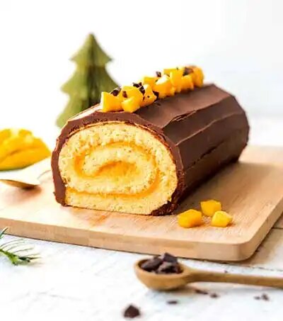 Простое в приготовлении от начала до конца, оно состоит из нежного бисквита с привкусом рома, свежего манго и восхитительного шоколадного ганаша. Это рождественское полено отлично дополнит ваш праздничный стол. Этот десерт очень фруктовый с оттенком экзотики. Все это заставит вас забыть о зимнем времени и перенесет в теплые и солнечные тропические страны. Вот рецепт рождественского полена. Для приготовления нам будут нужны вот эти продукты: