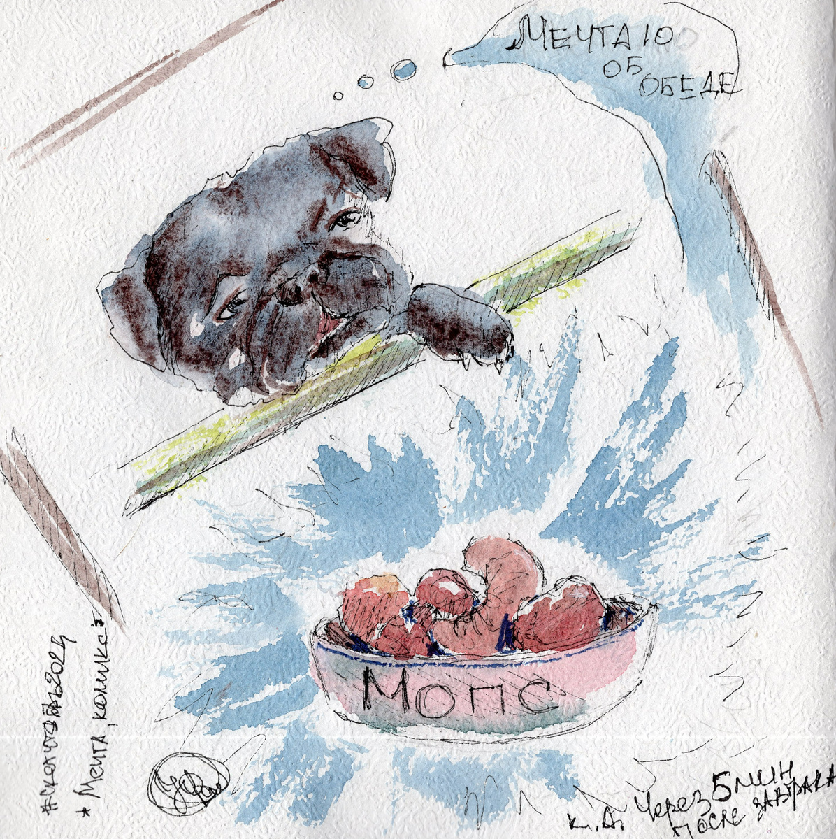 Не смогла выбрать из двух праздников. Они гармонично для меня переплетаются. Нужно ли кому-то объяснять что такое "комикс"? По моему все знают, что это история с картинками и текстом. Подобные истории известны мне кажется во всех странах мира так или иначе. У нас вот были лубочные картинки, где тоже рассказывали/показывали разные истории, сказки, притчи. А что такое мечта в словах и не объяснить. Для каждого это что-то особенное, свое. То к чему хочется идти, даже когда нельзя. Как шутят мои родные: тогда лежи по направлению к мечте! ) Вдохновилась милой фотографией из сети интернет, где был просто висящий лапой на перекладине мопс. И у нас есть такой черный мопс, который зависая подобным образом может мечтать об обеде..... едва позавтракав. Автору на краски и кисточки. Где меня еще можно найти: QuadArt - мечтаю каждый день делать квад, то есть рисовать не меньше четырех артов в день - на ВК. Подписывайтесь на мой канал, ставьте лайки и делайте репосты, если вам это не трудно. Спасибо!