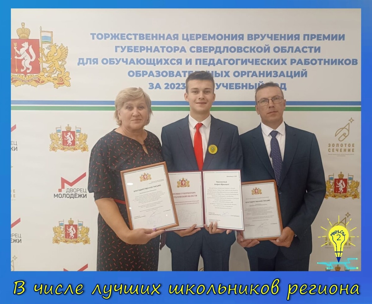 Заместитель Губернатора Свердловской области Павел Креков вручил денежные премии 193 школьникам и 103 педагогам, которыми по праву гордится наш регион. Напомним, такие награды традиционно присуждаются учащимся, добившимся успехов в различных конкурсах и соревнованиях. Их получили школьники, проявившие выдающиеся способности в интеллектуальной, спортивной, социально значимой и творческой деятельности. Мы гордимся, что среди награждённых есть два выпускника 2024 года: Владимир Евдокимов, выпускник 11″А» класса, абсолютный победитель регионального этапа Всероссийской олимпиады школьников и участник заключительного этапа; Андрей Никитин, выпускник 9″Д» класса, неоднократный победитель первенства Свердловской области по лёгкой атлетике, участник международных соревнований по легкой атлетике, призёр Финала XXII летней юношеской Спартакиады учащихся России. За подготовку выдающихся спортсменов благодарим: Александра Николаевича Попова, учителя физической культуры нашей школы;