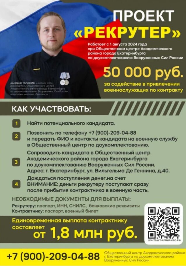 В Екатеринбурге предлагают 50 тысяч рублей каждому, кто приведет добровольца для заключения контракта с Вооруженными силами. Количество таких добровольцев не ограничено, пишет E1.RU.