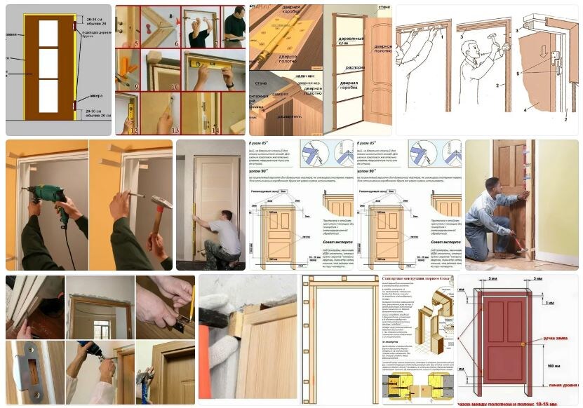 Установка дверей начинается с демонтажа предыдущих конструкций. Потом собираете дверную коробку или устанавливаете готовую. При этом необходимо смотреть за тем, что бы она не изменила свою геометрию. Если дверь уже навешана, то дальше вам нужно будет заделать щели между дверной коробкой и проёмом монтажной пеной и установить доборный элемент с наличниками, если нет, то вам придётся вначале навесить дверь.