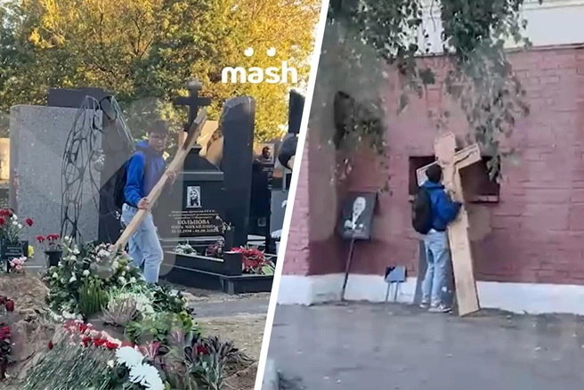 19-летний вандал разгромил могилу телеведущего Александра Маслякова, расположенную на Новодевичьем кладбище в Москве. Его задержали и доставили в отдел полиции для разбирательства, сообщает Мsk1.ru. 19-летний москвич разгромил могилу Александра Маслякова на Новодевичьем кладбище. В пресс-службе Главного управления МВД России по Москве сообщили, что вандала задержали и отвезли на допрос в полицию. Акт вандализма попал на камеру. На кадрах видно, что парень в синей толстовке и с рюкзаком на спине вытащил из могилы крест и фотографии, а также разбросал цветы. После этого он попытался сбежать на самокате. Как пишет телеграм-канал SHOT, могилу Александра Маслякова на Новодевичьем кладбище разгромил 19-летний москвич Кирилл К. По информации канала, парень заявил, что ведущий КВН «не достоин там лежать». По предварительным данным, молодой человек находился под воздействием наркотиков. Фото: телеграм-канал Mash Как пишет ТАСС, в правоохранительных органах сообщили, что за осквернение захоронен