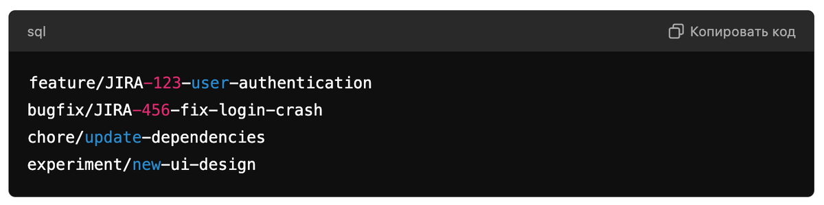 При именовании временных веток в Git, важно следовать стандартам, которые делают ветки легко читаемыми, понятными и отражающими цель работы. Вот несколько рекомендаций по именованию временных веток: Для удобства различия веток можно использовать префиксы, которые указывают на назначение ветки: В названии ветки опишите, что именно реализуется или исправляется: Если у вас есть трекер задач (например, Jira, YouTrack, Trello), используйте идентификатор задачи в названии ветки. Это поможет легче связывать код с конкретной задачей: Следуйте единому стилю, используя маленькие буквы и дефисы для разделения слов: Название ветки должно быть кратким, но в то же время информативным. Не стоит писать слишком длинные или слишком общие названия: Каждая ветка должна иметь уникальное название, чтобы избежать путаницы и коллизий. Следуя этим правилам, вы создадите понятную и легко поддерживаемую систему именования веток. Если вам интересен контент, который я создаю, и вы хотите видеть больше статей на те