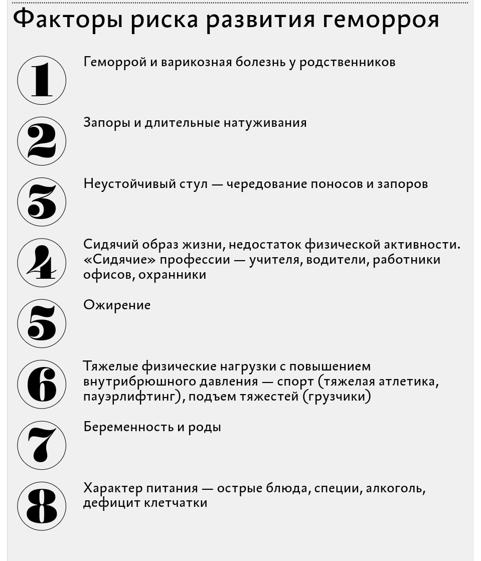 Большинство пациентов с геморроем не обращаются к врачу, пытаются решить проблему самостоятельно, следовать советам фармацевта или соседки. Поэтому точную частоту возникновения геморроя определить сложно — по официальным данным он встречается у 10–15% взрослых. Основную проблему в своевременной диагностике составляют пациенты, которые не рассказывают врачу о своих жалобах. Они пытаются утаить или просто не говорить о них, обращаясь по поводу другой проблемы. У каждого на это свои причины — кто-то просто стесняется, другой привык «с этим жить», ну а третий лечится травками. Эксперименты самолечения заканчиваются тяжелыми осложнениями, например, кровотечением или тромбозом геморроидального узла. Если у вас нет геморроя, проверьте себя на факторы риска его возникновения. При наличии факторов риска будьте к себе особенно внимательны. Нелеченный геморрой переходит в хроническую стадию. Его проявления зависят от того, внешний или внутренний геморрой. Для того, чтобы геморрой не прогресси