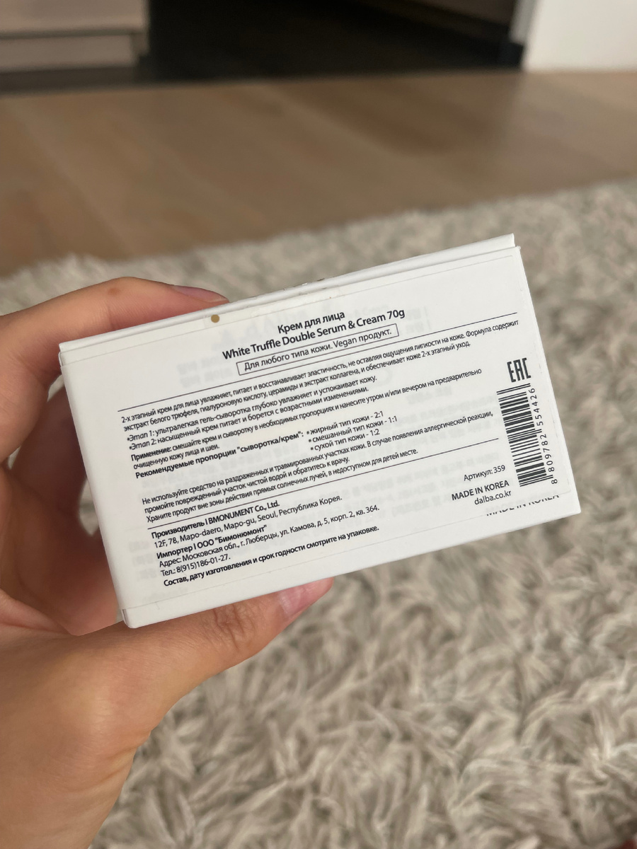 Мой новый любимчик это крем для лица от D'Alba 2-этапный для увлажнения и питания White Truffle Double Serum & Cream. Мне вообще очень прилюбился этот корейский бренд. Упаковка не придраться, все продумано, баночка-шайба из пластика под стекло с откручивающейся крышкой в картонной коробочке, дизайн очень приятный, есть защита от вскрытия. Дорого-богато. Внутри лопаточка, пластиковая откидная крышечка и разделенные на две части отделения, где находятся крем и серум. Берешь с собой одну банку, а там 2 продукта, очень удобно. Объем 70 грамм (35+35). Крем нежный жирненький цвета сливочного масла, серум по консистенции гелевый, медового цвета, но ложится на кожу прозрачно. Производитель рекомендует смешивать продукты и дает инструкцию по рекомендации к смешиванию в зависимости от типа кожи (Для жирного типа кожи - Сыворотка : Крем 2:1, для смешанного типа кожи - Сыворотка : Крем 1:1, для сухого типа кожи - Сыворотка : Крем 1:2.) Крем больше работает на питание, серум на увлажнение, и