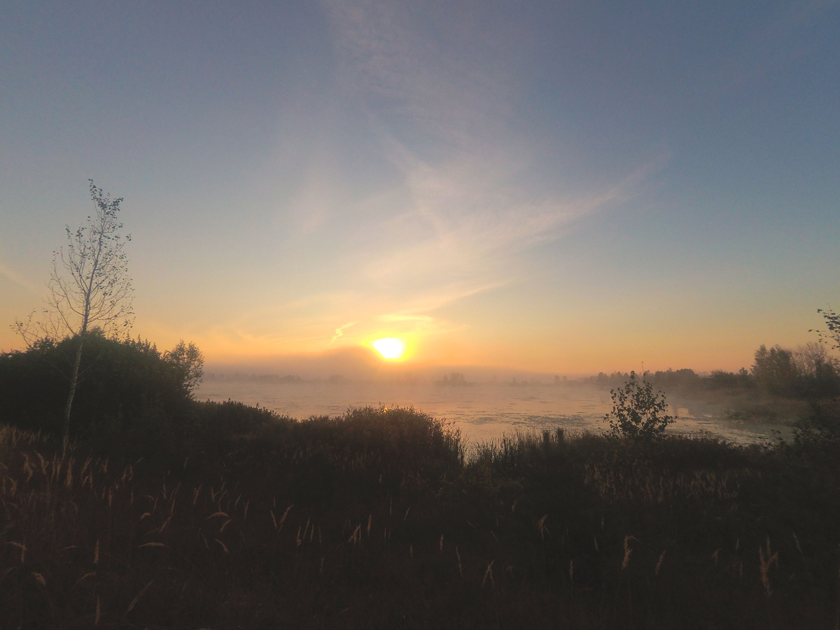 Очередное утро. Я вновь пришёл на озеро пораньше. Солнце ещё только поднимается. А на воде по по-прежнему тихо. Не сравнить с рыбьей столовой в первый вечер посещения. Вот когда нужно было ловить. Но, как говориться, "Лучше поздно, чем никогда". Зато на скрытом туманом берегу, за прибрежными зарослями, кто-то шумит. Да как громко. Там не то что трава, кусты, там ветки трещат. Сразу мысль - медведь или лось. (Человека сразу отметаем. Нечего ему там делать, в кустах, в полседьмого утра, за 6 км от города)) Медведь это, конечно, не очень хорошо. С другой стороны, сентябрь - время кормиться лесом, ягоды там всякие лопать, а не людей, так что пока половим. И снова всё утро продолжалась череда нерешительных поклёвок. Первый карась попался как по расписанию. В десять утра. И снова не один. Сегодня я уже целенаправленно перешёл на перловку в качестве насадки. Неплохо клюёт на червя, но количество пустых поклёвок просто зашкаливает. Стоит заметить, что поклёвки карася происходили уже и посреди