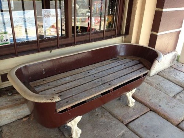 Старая ванна в качестве резервуара для воды - дело обычное. Но это у нас с вами, обычных людей. Люди креативные придумывают другие способы пристроить антикварное чугунное корыто в саду. Я видела столики, парники, мангалы, уличные печки из ванны. А еще можно сделать вполне комфортабельную скамейку со спинкой и подлокотниками.