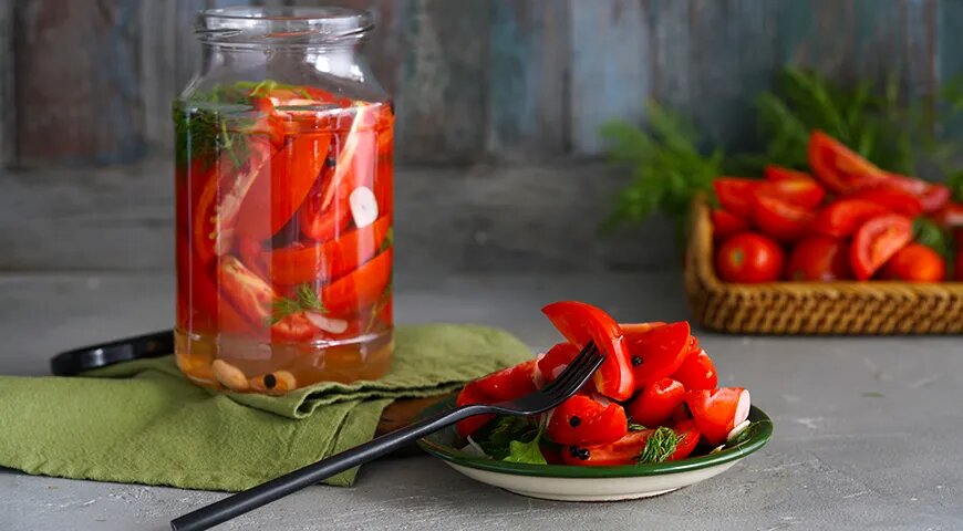 Быстро приготовленные малосольные помидоры обязательно придутся по вкусу всем любителям таких холодных закусок. Такое увлечение полностью соответствует традициям русской кухни. ИНГРЕДИЕНТЫ Помидоры нужно вымыть и тщательно обсушить бумажным полотенцем. Затем нарежьте их крупными дольками и аккуратно поместите в чистую банку. Важно резать так, чтобы семенная часть не выпала. К долькам помидоров добавьте остальные ингредиенты – чеснок, зелень и перец горошком. Перемешивать или утрамбовывать не следует, чтобы томатный сок оставался внутри мякоти. В одном литре теплой воды растворите сахар, уксус и соль. Тщательно перемешайте и залейте этим рассолом помидоры в банке. Закройте крышкой и оставьте на 3-5 часов. Если Вам понравился рецепт, ставьте лайки, подписывайтесь на нас.