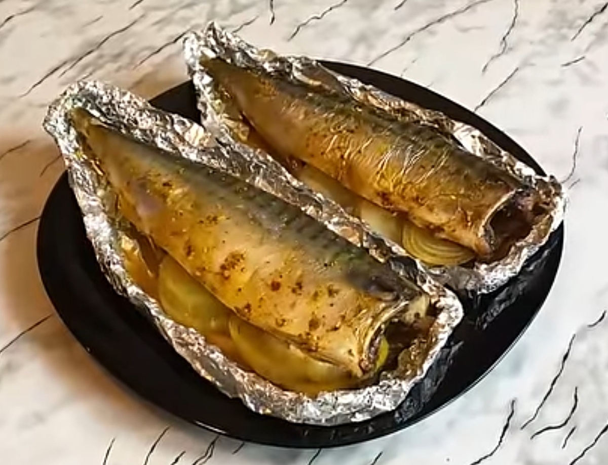 Отличное блюдо для обеда или ужина. Скумбрия отличается своей жирностью и полезными свойствами. Рыба получается вкусной и сочной. Советую приготовить по этому простейшему рецепту. Продукты: 1) Скумбрия - 2 шт 2) Лук - 2 шт 3) Лимон - 2 шт 4) Приправа для рыбы 5) Соль, перец - по вкусу Рецепт: Рыбу нужно помыть, почистить, убрать плавники. И самое главное — убрать чёрную плёнку с рёбер, а то будет неприятно горчить. Теперь посолим, поперчим и используем приправу для рыбы. Всё хорошо повтирать и взбрызнуть сверху и внутри лимонным соком. Отправим нашу скумбрию в холодильник на 30 минут, чтобы промариновалась. Нарезаем тоненько лук. От лимона нужно четыре колечка. Выкладываем скумбрию на пищевую фольгу и укладываем в неё по два кусочка лимона и лук. Заворачиваем рыбу в фольгу и отправляем в разогретую до 180° духовку на 40 минут. Через 40 минут разворачиваем от фольги и отправляем в духовку еще на 5 минут, чтобы запеклась курочка. Всё, н