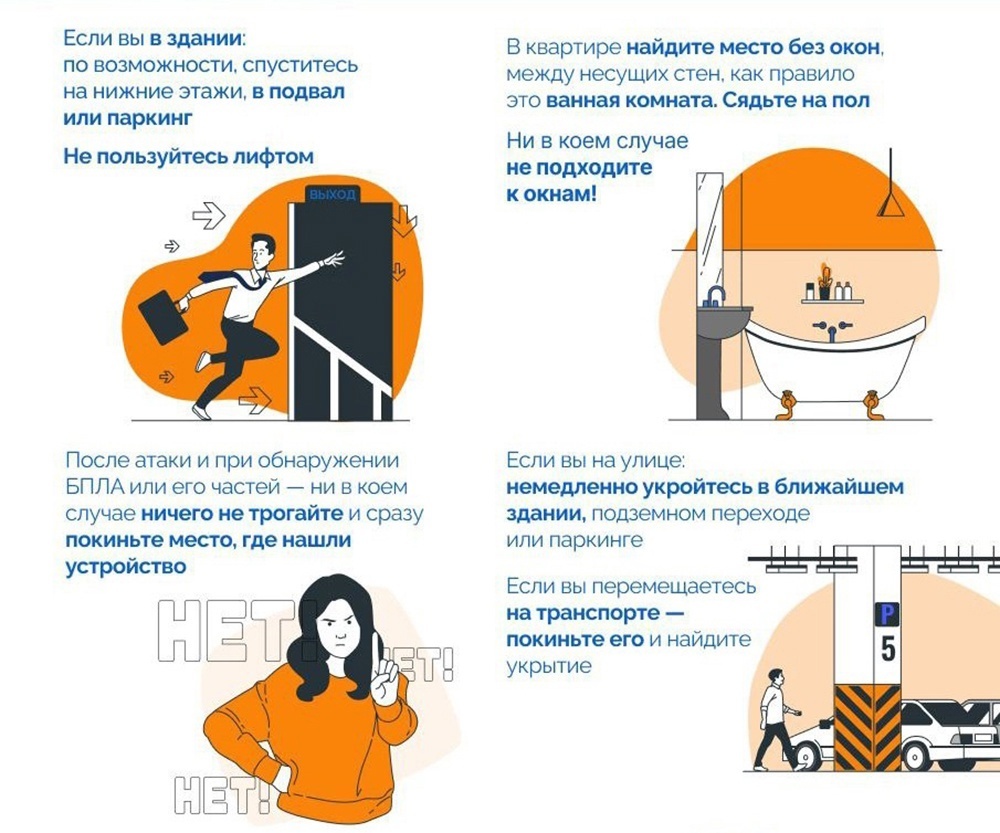 - Если атака застала вас в здании, спуститесь в подвал или паркинг, избегая лифта.