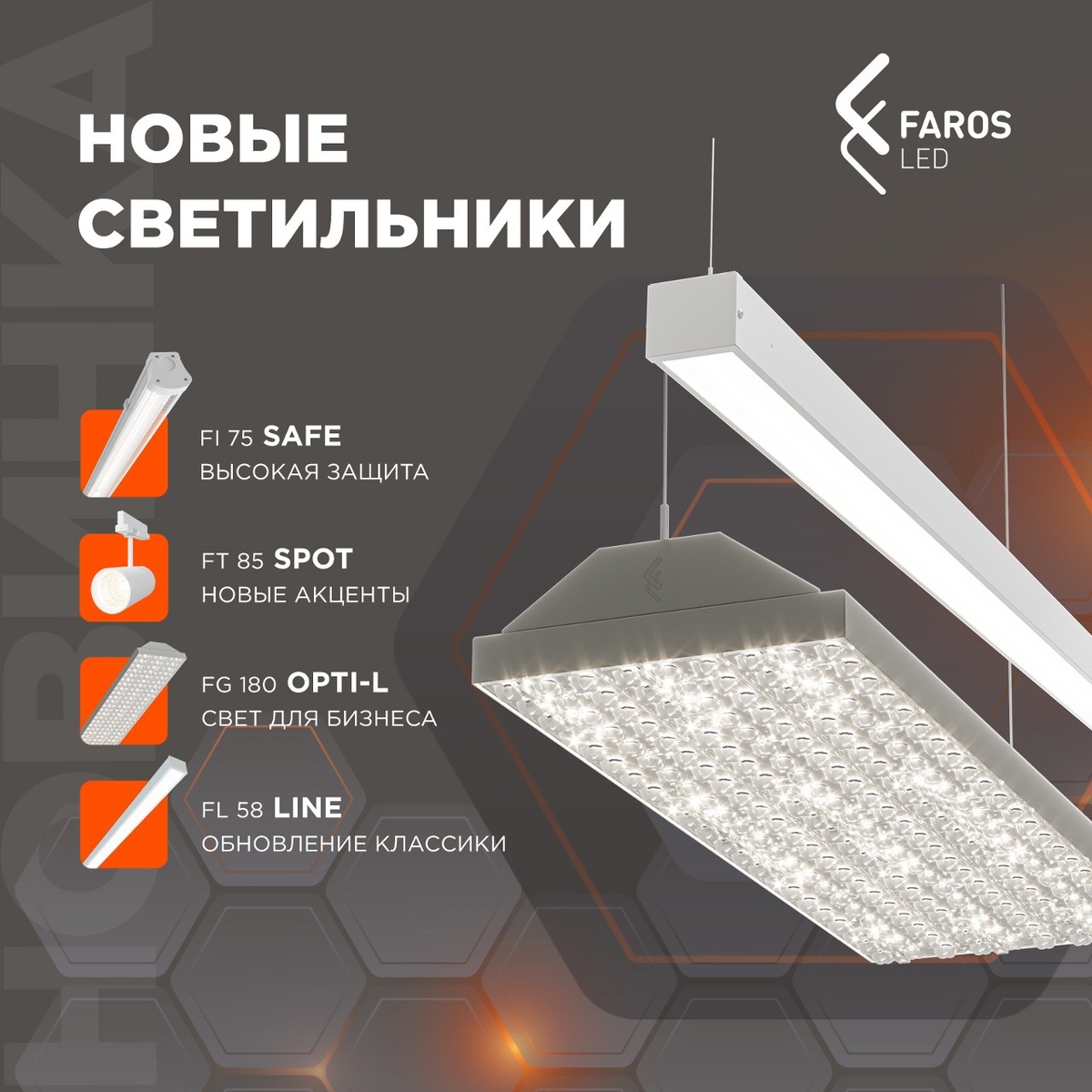 FAROS LED представляет осенние новинки серий и исполнений светильников. Все изделия добавлены в обновленный прайс-лист компании и доступны для заказов! Новые серии: FI 75 SAFE – промышленный линейный светильник быстрого монтажа, выполненный в прочном, легком и надежном корпусе из поликарбоната. Корпус и рассеиватель светильника, изготовленные методом экструзии, представляют собой единое целое. Серия имеет герметичную конструкцию и высокую степень защиты IP65, что делает светильник оптимальным для использования в сложных условиях, с регулярным воздействием пыли и влаги. Компактные размеры, легкость монтажа и высокая надежность обеспечивают удобство в эксплуатации. Сфера применения: производственные и складские помещения, подземные парковки, автомойки и автосервисы, подсобные технические помещения. FT 85 SPOT – дизайнерский трековый светильник акцентного освещения, с фиксированным углом раскрытия светового потока. Имеет 5 типов КСС на выбор. Благодаря современному дизайну и удобной эр