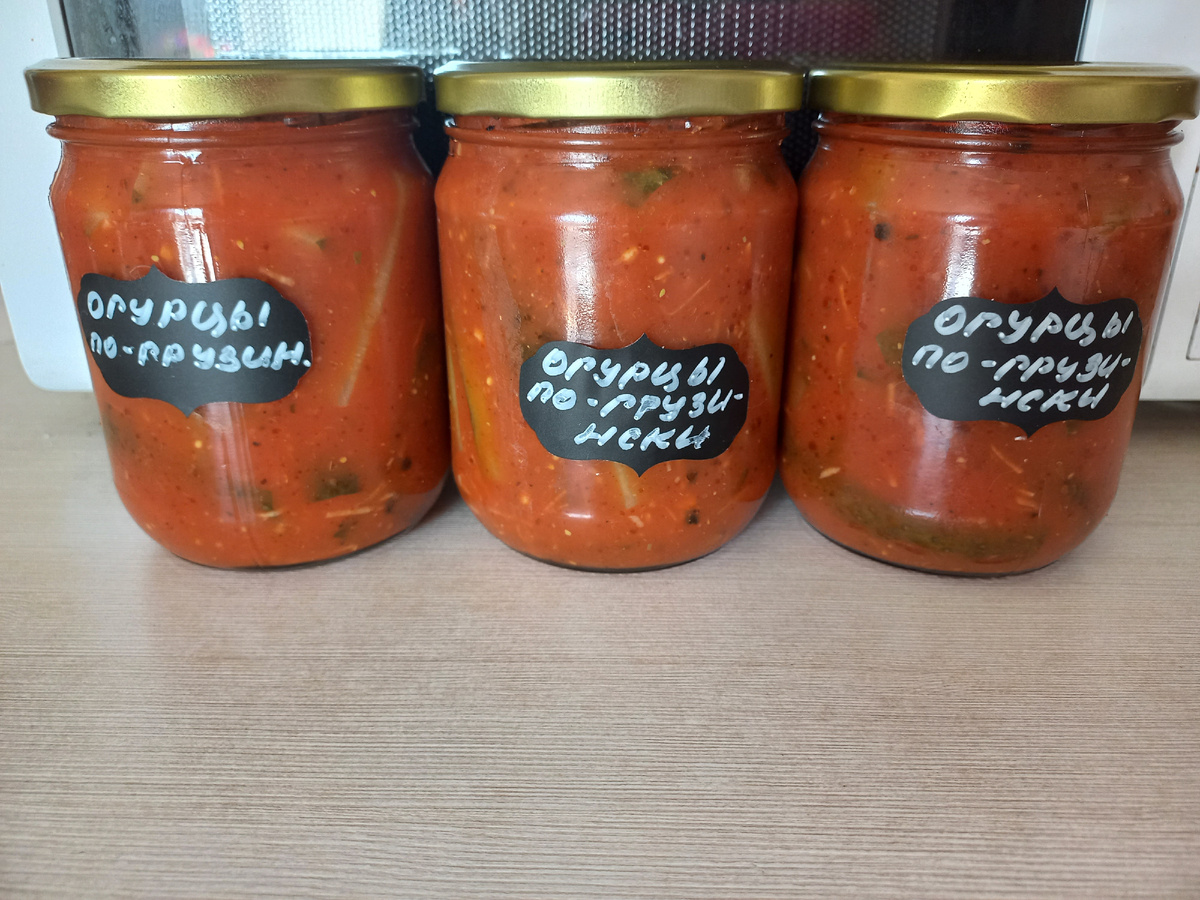 Всем привет! Если Вы, как и я еще не "отстрелялись" с заготовками огурцов на зиму, то советую Вам приготовить несколько баночек огурцов-по грузински. Рецепт простой, но сочетание интересное. Зимой достану такую баночку огурчиков к жаренной картошечке...ммм... будет очень вкусно! Способ приготовления: Огурцы моем, отрезаем с двух сторон "хвостики". Каждый огурчик режем на 4 части. Готовим маринад . В кастрюлю выливаем томатный сок, добавляем пропущенный через пресс чеснок, соль, сахар, растительное масло, специи по вкусу. Доводим до кипения маринад, вливаем уксус, убавляем огонь и варим еще 7 минут. Выкладываем в маринад огурцы и варим 7 минут. Раскладываем огурцы в стерилизованные банки. Переворачиваем банки на крышки и убираем под плед, до полного остывания банок. Храним в холодильнике или в прохладном месте. Ингредиенты (на 3 баночки по 0,5л): Огурцы-1 кг. Томатный сок-1 л. Соль-50 гр. Сахар-50 гр. Чеснок-5 зубчиков Растительное масло- 50 мл. Уксус 9%-2 ст. ложки
