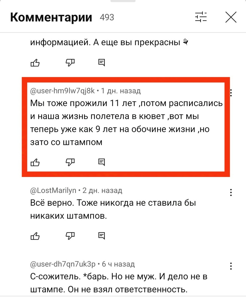 На картинках вы видели некоторые истории реальных людей, которые взяла из Ютуба. Просто открывала темы отношений и читала, что люди пишут. Им не понятно, почему, когда встречались, было все хорошо. Их носили на руках, дарили подарки. А после штампа все закончилось.
