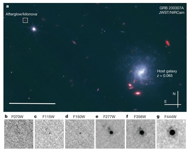 (Результаты: Вселенная. «ХиЖ» 2024 №8) Космические всплески гамма-излучения, которые впервые обнаружили в середине прошлого века, длятся от секунд до минут. Причина долгоживущих всплесков — это термоядерные взрывы сверхновых, случающиеся в конце жизни звезд. Короткие всплески отражают формирование килоновых звезд, возникающих при слиянии нейтронной звезды с такой же звездой или с черной дырой. Всплеск GRB230307A, второй по яркости за последние полстолетия, произошел в марте 2023 года. Первым его обнаружил «Космический гамма-телескоп Ферми». Величина излучения в тот момент в тысячу раз превысила типичную для всплеска. Тогда же с помощью многочисленных телескопов наблюдатели точно определили источник всплеска и проследили, как менялась яркость за 200 секунд его существования. При этом цвет послесвечения изменился с синего на красный. Хотя длительность всплеска указывала на сверхновую, астрофизики нашли в свечении отпечатки ядерного синтеза, свойственного коротким вспышкам, и сделали выво