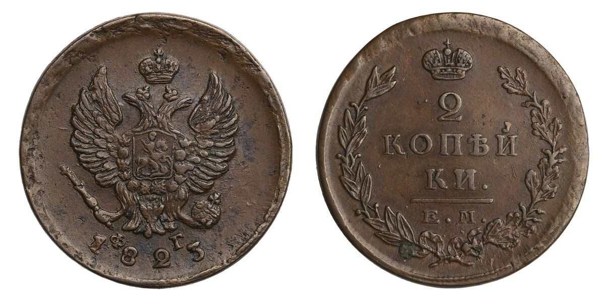 Друзья, снова рад приветствовать Вас на канале “Забытое…”. Как Вы уже могли догадаться из названия, сегодня у нас продолжение цикла публикаций о разновидностях и подробном описании монет Российской империи и СССР. На этот раз повествование пойдет об экземпляре периода Российской империи, а именно о двух копейках 1823 года. Погнали!😉 Данный экземпляр чеканился в период правления императора Александра I (1801-1825 гг.) на Екатеринбургском (“Е.М.”) и Сузунском (“К.М.” - Колыванская медь) монетных дворах в 1823 году. Вес медной монеты составляет 13 грамм. Экземпляры имеют гладкий гурт. Общий тираж монет (Екатеринбургского и Сузунского монетных дворов) составил более 45 млн. экземпляров. Экземпляр имеет четыре разновидности. Основная разновидность данных монет заключается в обозначении монетного двора (“К.М.” или "Е.М.") и инициалах минцмейстера ("Ф Г", "П Г" или "А М"). Одна монета является новодельным экземпляром. У двух монет имеется степень редкости. В 2023 году на нумизматическом инте