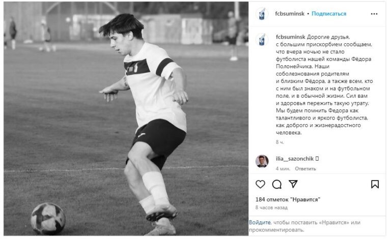 — Дорогие друзья, с большим прискорбием сообщаем, что вчера ночью не стало футболиста нашей команды Фёдора Полонейчика. Наши соболезнования родителям и близким Фёдора, а также всем, кто с ним был знаком и на футбольном поле, и в обычной жизни. Сил вам и здоровья пережить такую утрату. Мы будем помнить Фёдора как талантливого и яркого футболиста, как доброго и жизнерадостного человека, — написано в сообщении клуба.