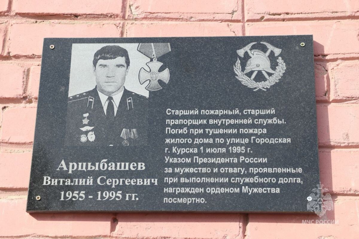 В Курске на фасаде 12-ой пожарно-спасательной части МЧС России открыли мемориальную доску в память о погибшем огнеборце Виталии Арцыбашеве. Пожарный погиб 1 июля 1995 года от удара током во время тушения пожара на улице Городской в областном центре. Огонь быстро распространялся, горящие здания были обесточены, но через один из домов проходил скрытый электропровод. Он и стал причиной трагедии. На торжественной церемонии присутствовали сын и вдова героя, сотрудники ГУ МЧС России по Курской области. Указом Президента РФ за мужество и отвагу, проявленные при выполнении служебного долга, старший прапорщик Арцыбашев посмертно награждён «Орденом Мужества».