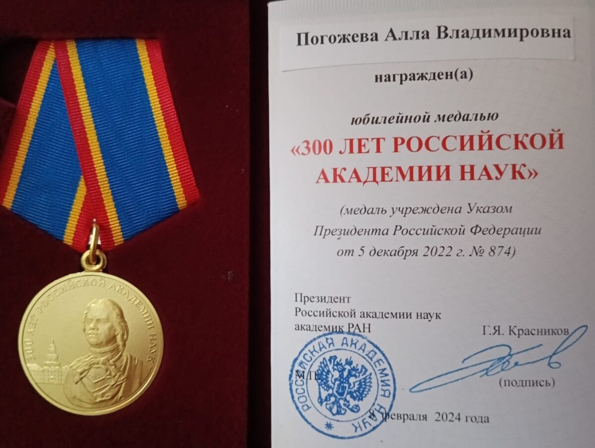 Наш академик, доктор наук Погожева Алла Владимировна стала кавалером медали «300 лет Российской академии наук», учреждённой Указом Президента Российской Федерации от 05.12.2022 г. № 874.