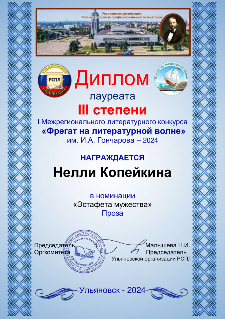 Отрадно то, что наши академики-литераторы, не взирая на то, что их произведения широко публикуются, являются участниками различных литературных конкурсов. По приглашению академика ИАСК, Председателя совета правления Российского союза профессиональных литераторов Маниной Ирины Ивановны Президент ИАСК Копейкина Нелли Григорьевна принимает участие в ряде конкурсов, организованных РСПЛ, разными его отделениями. Ульяновское отделение РСПЛ провело в этом году IМежрегиональный литературный конкурс «Фрегат на литературной волне» им. И.А.Гончарова. В этом конкурсе Нелли Григорьевна стала лауреатом III степени в номинации ЭСТАФЕТА МУЖЕСТВА.