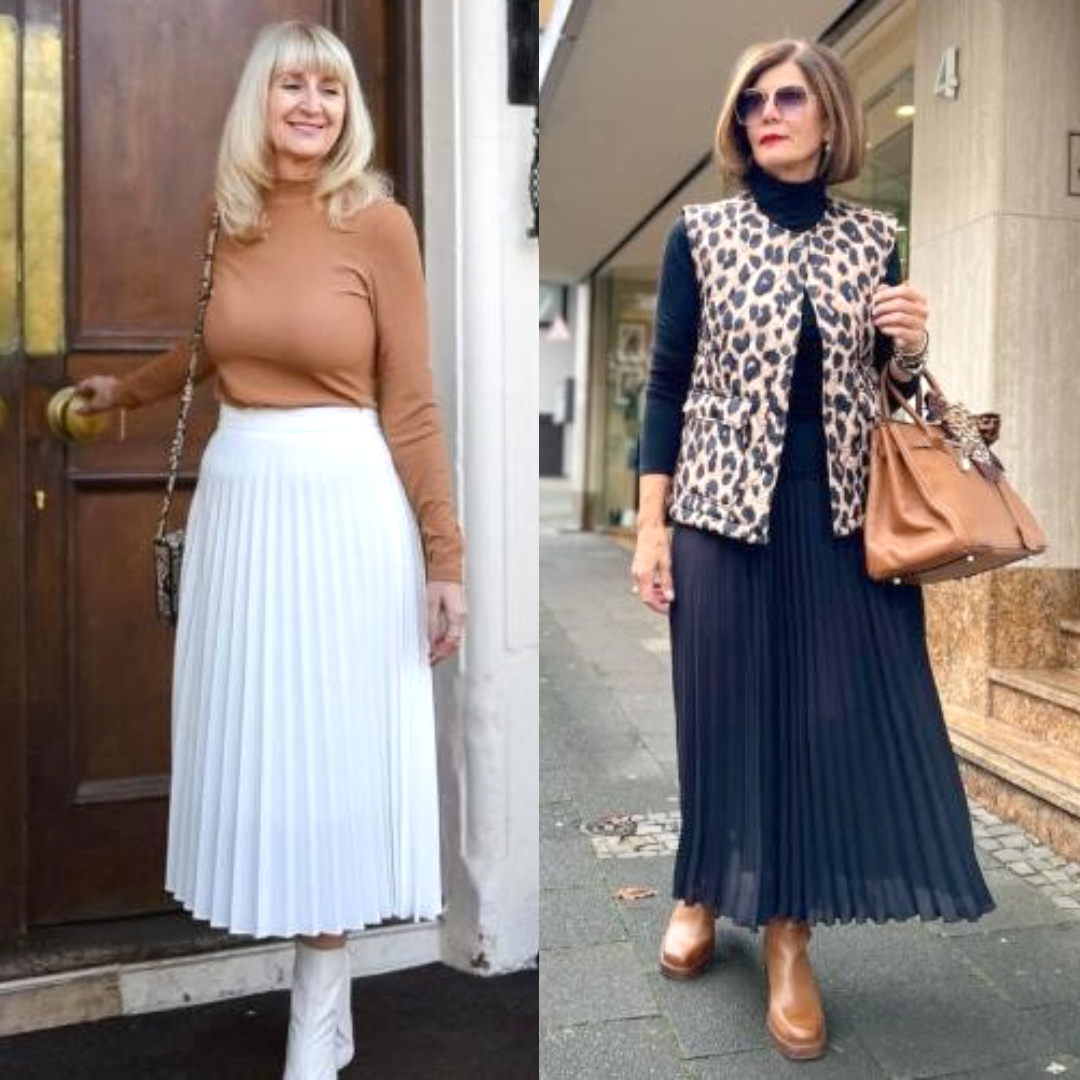Подобрать «верх» к такой юбке будет несложно. Все зависит от личных вкусовых предпочтений дамы и погодных условий. К примеру, если требуется создать расслабленный и романтичный образ, то можно надеть светлую плиссированную юбку с однотонной водолазкой бежевого или светло-коричневого оттенка. Если нужно что-то более строгое, то подойдет такой вариант: темная юбка макси с плиссировкой, черная водолазка и жилет с леопардовым принтом.