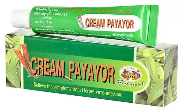 Крем от герпеса Payayor от тайского производителя натуральной косметики и средств по уходу Abhaibhubejhr — популярное эффективное и безопасное тайское средство для борьбы с вирусом герпеса. Содержит экстракт растения клинакантуса поникающего, известного своей противовирусной активностью. 100% натуральный природный продукт. Бактерицидный крем Payayor на основе природных трав – это эффективное противовоспалительное натуральное тайское средство наружного применения для лечения вируса герпеса, аллергических реакций на коже, крапивницы, зуда, жжений кожи, укусов насекомых. Крем Payayor эффективно блокирует вирус, останавливает образование новых появлений, снимает зуд. Он поможет как при лечении только начинающегося герпеса (эффективно снимает боль и жжение), так и для лечения язвочек и ранок после герпеса. А при выс