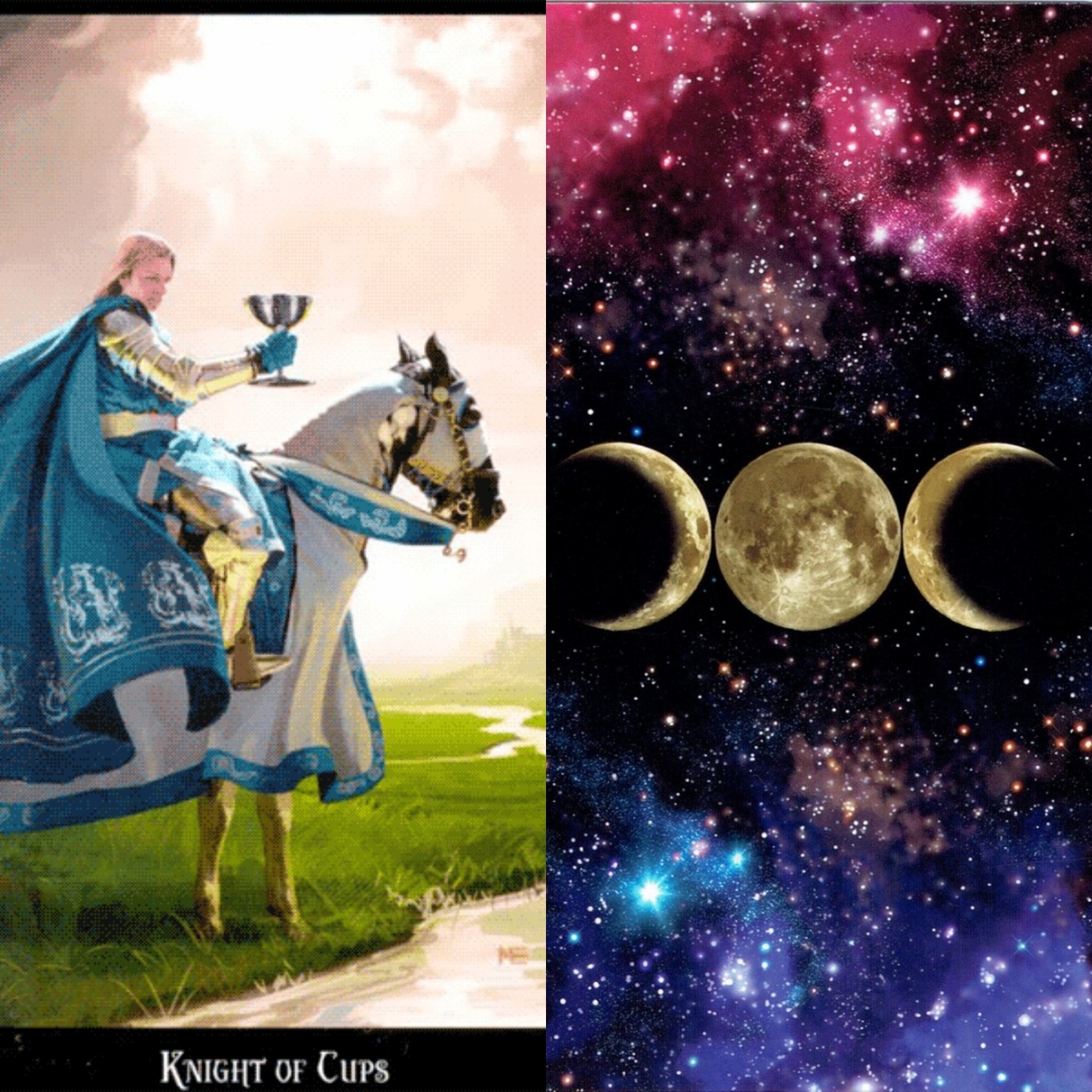 🧿 РЫЦАРЬ КУБКОВ 📌 автор колоды "Колдовское Таро" Эллен Дуган. Красивый белокурый Рыцарь Кубков медленно едет верхом на лошади по зелёному полю. На заднем плане сгущаются тучи, а вдалеке виднеется замок. Обуздав красивого серого коня, Рыцарь следует вдоль сверкающей реки в сторону замка. Молодой человек с мечтательным выражением лица всматривается в серебряный кубок, который держит в руке, как будто видит в нём какое-то отражение. Кубок, изображенный на этой карте, олицетворяет священный клубок Грааль традиционный символ божественного женского начала. В руках Рыцаря не видно меча, но всё же он облачён в серебряную кольчугу, поверх которой накинут красиво струящийся голубой плащ. Этот Рыцарь не воинственный, а элегантный. Волнообразные складки на его плаще и попоне коня ещё больше связывают Рыцаря с элементом Воды. Геральдика в виде двухвостых русалочек, украшающая накидку, символизирует красноречие, преданность и честность. Двухвостая русалочка это мифическая Мелюзина, дух чистой во