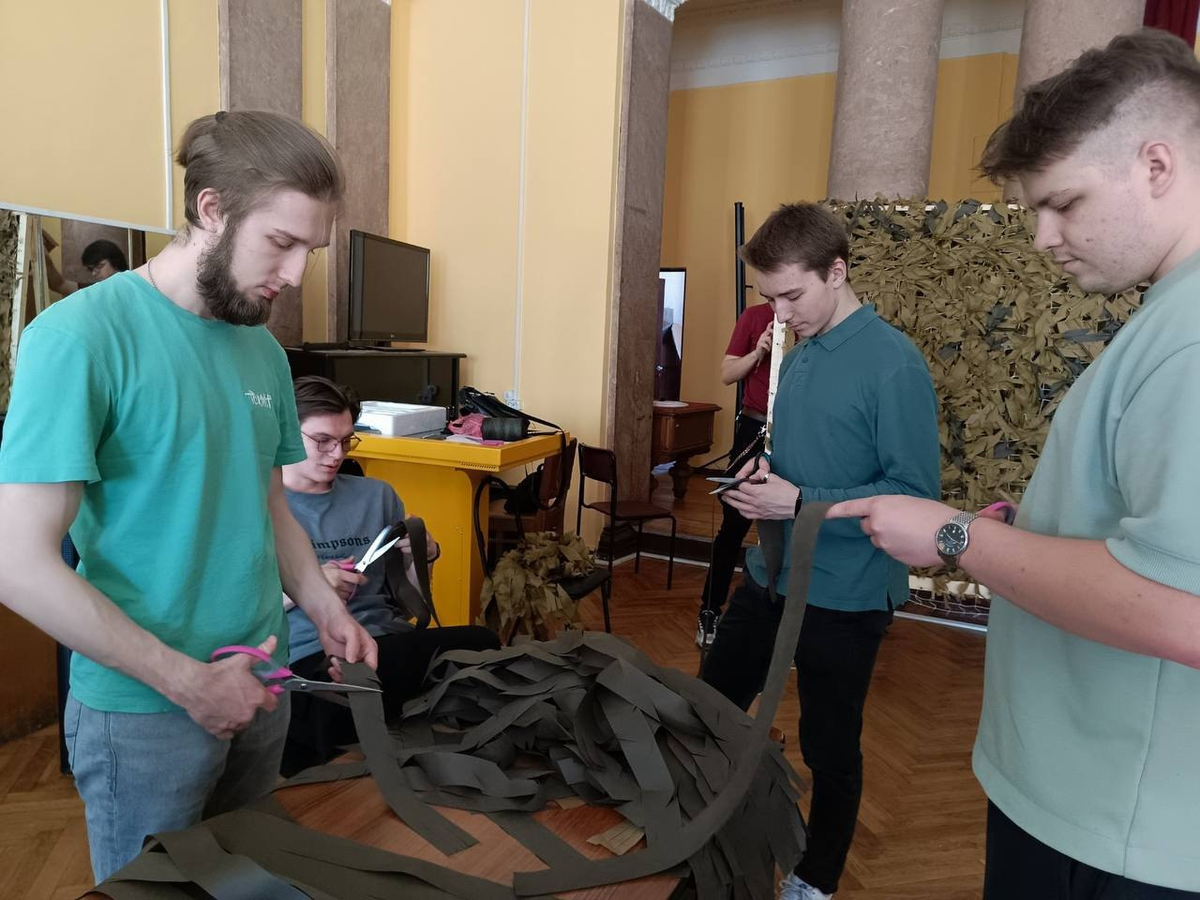 Студенты и преподаватели Балтийского государственного технического университета «ВОЕНМЕХ» им. Д.Ф. Устинова плетут маскировочные сети для бойцов СВО.
