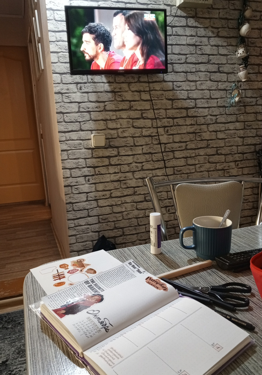 Добрый день, друзья! В это воскресенье подготовила недельные развороты на октябрь. Я не выделяю для этого специальное время, просто совмещаю с чем-то еще. В этот раз делала под передачу "Звезды в джунглях". Я люблю такие соревновательные передачи, а множество рекламных пауз позволяют переключаться на свои дела. Расположилась на кухонном столе и мне никто не мешал: Первый планировочный разворот: Была сегодня у врача, взяла направление на снимок спины на 9 октября. Сразу вписала в график . Потом идут еще 3 недели месяца: Как всегда, самые интересные решения получаются, когда пытаешься спрятать косяки. Пришлось заклеить лентой некрасиво начерченную линию: 🔹🔹🔹 Ещё, раз уж я завела новый проект для себя, сделала разворот с поставленными целями, которые вам озвучила, а рядом место для результатов: И оставила пару страниц для заметок, украсив наклейками: Спасибо, что остаётесь со мной! 💕