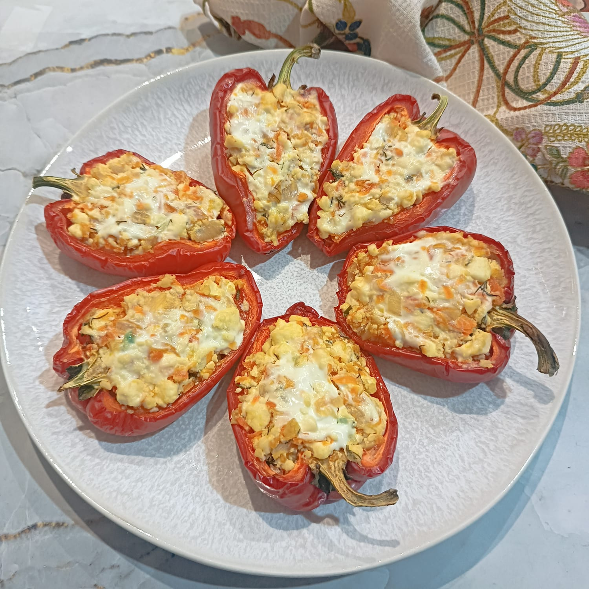 Всем привет! И ещё одна идея для красного болгарского перца! Я долго не поддавалась соблазнам начинить перец чем-то другим, кроме мяса с рисом )) Но для разнообразия всё же попробовала начинить творогом с овощами и мне этот вариант неожиданно очень понравился! ))) Стала в сезон обязательно так готовить. Половинки перца начиняются и запекаются в духовке. По трудозатратам это проще и быстрее, как мне кажется, чем традиционный перец, да и по времени тоже. Для начинки на 3 больших перца (или 4-5 средних)