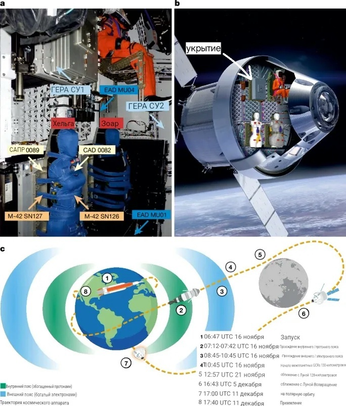НАСА опубликовало данные по радиации с миссии облета луны КК Орион Космическая радиация представляет заметную опасность для длительных полетов человека в космос. Связанные с этим риски включают 1 рак, 2 катаракту, 3 дегенеративные заболевания и тканевые реакции в результате большого острого облучения. Космическая радиация исходит из различных источников 1 галактические космические лучи, 2 пояса захваченных частиц (Ван Аллена) 3 события, связанные с солнечными частицами(солнечные вспышки) В связи с вышеперечисленными рисками проводились замеры уровня космического излучения при помощи разнообразных датчиков и дозы поглощенной радиации двумя манекенами , Ольга без защиты и Зоар с защитой . Что показали исследования Измерения внутреннего протонного пояса показывают четырехкратную разницу в мощности дозы между наиболее (M-42 SN127: 69 мкгр мин-1) и двумя наименее защищенными точками (EAD MU01: 240 мкгр мин-1 и HERA HSU2: 287 мкгр мин-1) в Орионе (рис. 2a) Тоесь в «УКРЫТИИ» радиационн