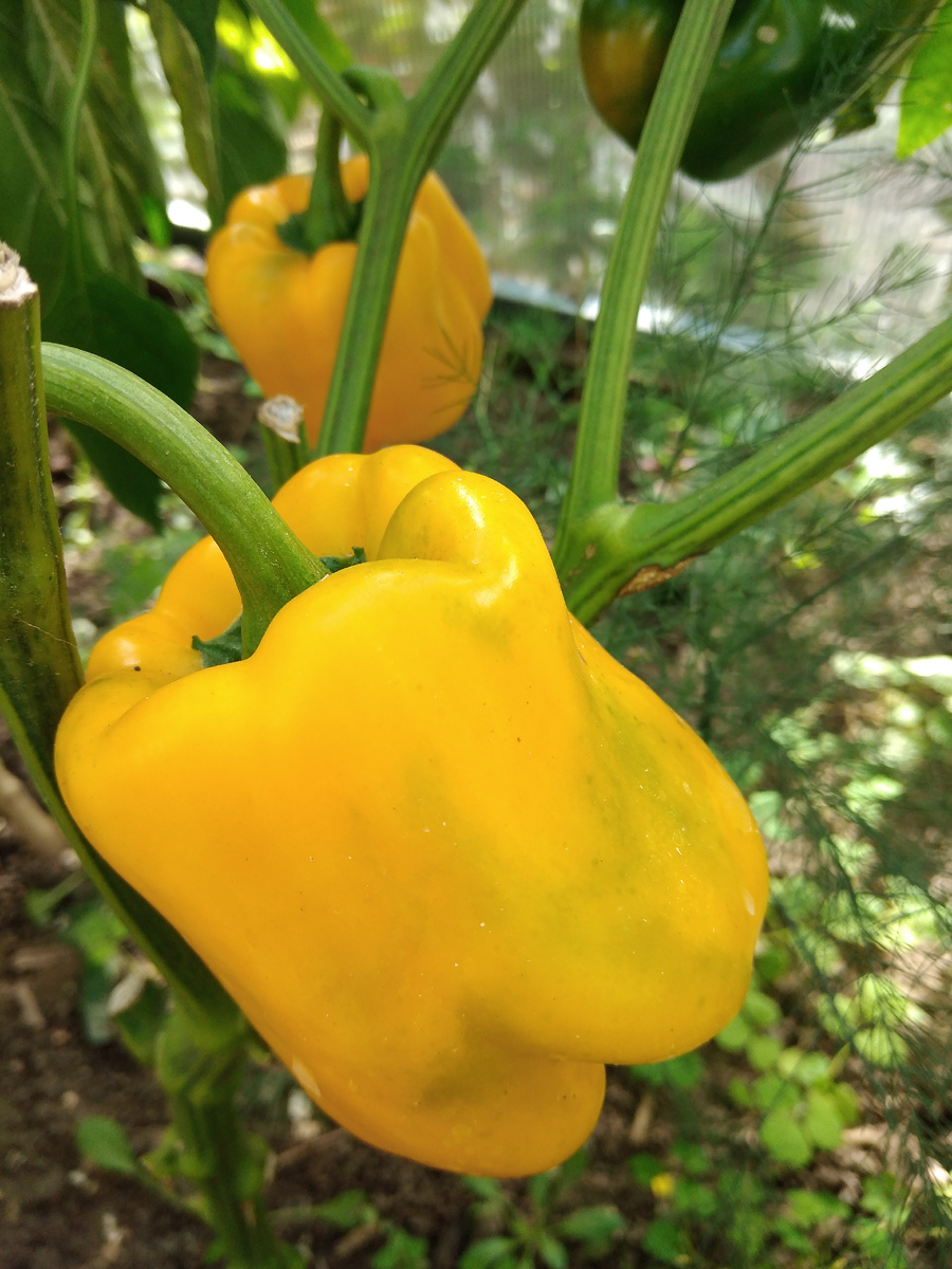 Перчик, который я, однозначно, рекомендую! Удивил своими размерами и весом. В этом году посадили на рассаду несколько таких перцев. Конец сентября, а Фельдмаршал продолжает плодоносить. Фото сделано 24го сентября. Итак, подробнее про сорт. Среднеспелый (120-130 дней) гибрид. Растение высотой 70-80 см, среднеоблиственное, одновременно формирует на кусте 8-10 крупных красивых плодов. Плоды кубовидно-призмовидные, в технической спелости темно-зеленые, в биологической – ярко-желтые, длиной 18-20 см, массой 350-400 г, сочные, сладкие, с высоким содержанием витамина С и каротина. Толщина стенки 1 см. Устойчив к комплексу болезней, стрессоустойчив. Транспортабельный. Пригоден к продолжительному хранению. Рекомендуется для употребления в свежем виде и переработки. Для того, чтобы собрать хороший урожай, этот сорт перца нужно выращивать в теплице. Весь сезон обрывали эти перцы зелёными, так как некоторые кустики под весом плодов падали и ломались. Осенью решили оставить несколько перчиков и