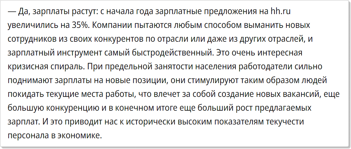 - При кадровом голоде за сотрудников, в самом деле, держатся, а не выжимают все соки уже на старте, чтобы заменить на такого же одноразового, когда этот кончится. Отсюда феноменальное вранье в вакансиях, которое господин Сергиенко на голубом глазу называет подъемом экономики. А на самом деле это очень нездоровое явление.