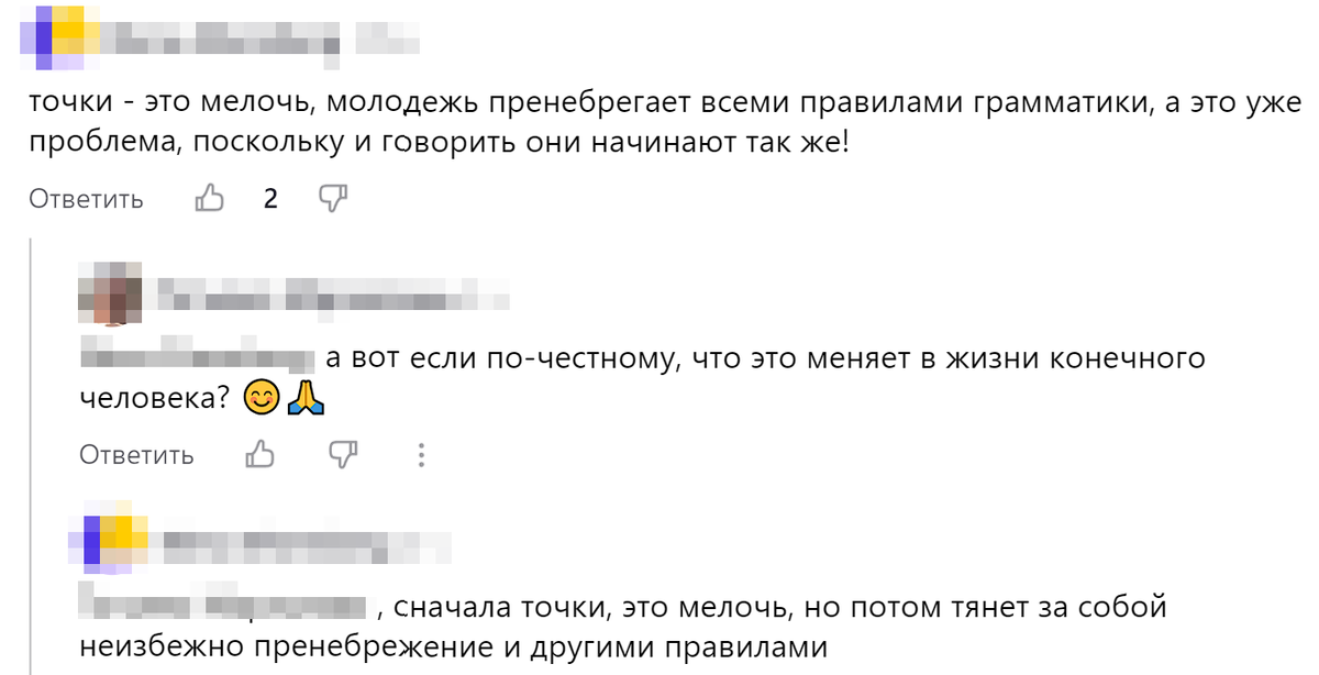 «Если не ставишь точку в конце сообщений, то ты безграмотный». Перечитываю комментарии