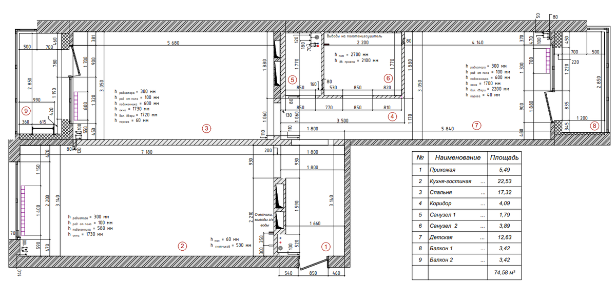 Квартира была куплена в новом доме без отделки, практически все стены внутри помещения несущие, поэтому особой перепланировки не было, лишь объединили санузел, при этом его немного расширили за счет площади коридора и сделали отдельную гардеробную в спальне родителей.