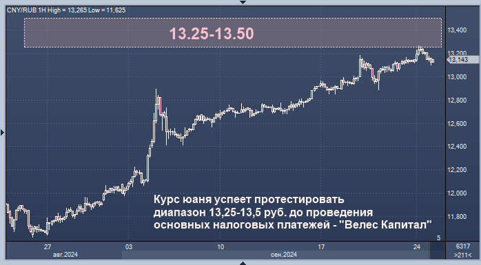 Курс юаня успеет протестировать диапазон 13,25-13,5 руб. до проведения основных налоговых платежей - "Велес Капитал"