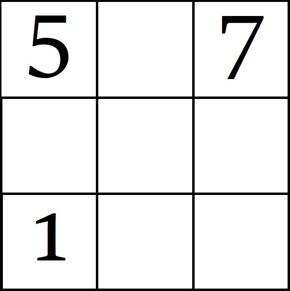 Задачка: Квадрат разделён на 9 клеток, в трёх из них поставлены числа 1, 5, 7. Расставьте в свободных клетках числа 0,2,3,4,6,8 так, чтобы в каждом столбце и каждой строке сумма равнялась 14.
