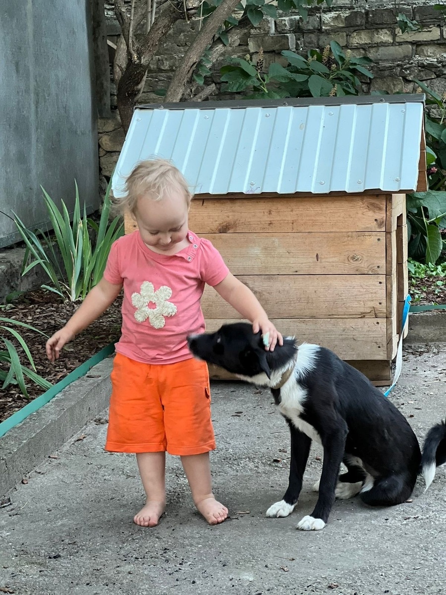А еще, наша дочь поначалу побаивалась новую подругу, а теперь ходит по утрам ее целовать, собралась переселиться к ней и периодически пытается ее подвинуть в будке. Ну и ест ее корм помаленьку😅😅😅»