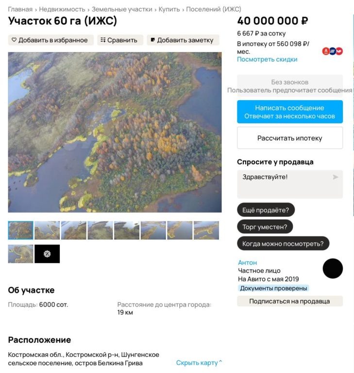 “Официально у острова нет названия, как нет и какой-то особенной истории. Построек на острове тоже нет. Дорога от Костромы до нужной точки на берегу Волги займет всего 15 минут, далее 1 километр любым водным транспортом. Известно, что вокруг острова находятся крупные нерестилища рыбы”, — говорится в объявлении.
