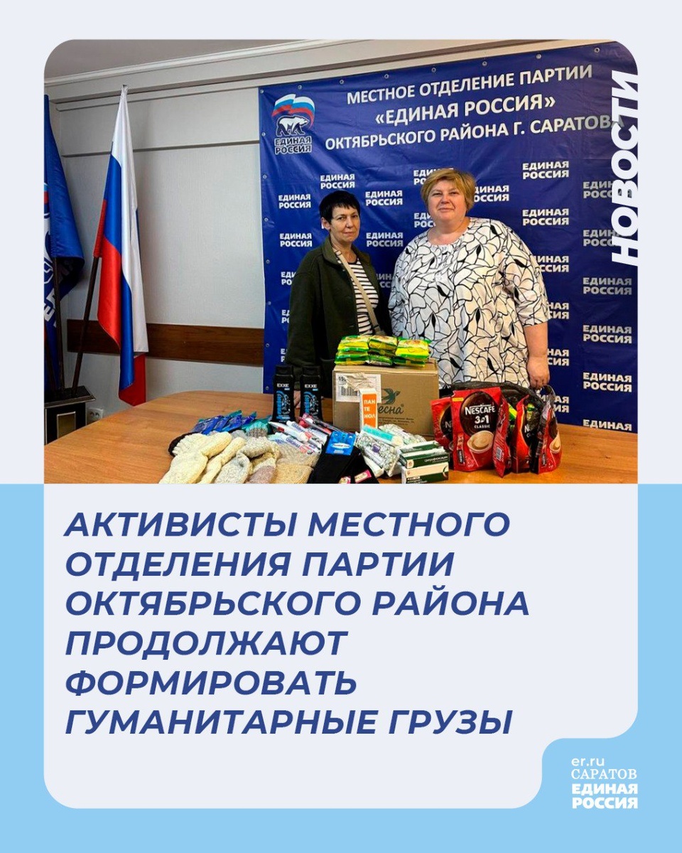 📦По инициативе секретаря саратовского регионального отделения партии «Единая Россия» Николая Панкова пункты приема и отправки гуманитарных грузов работают во всех местных отделениях партии во всех районов нашей области. Спортсмены и тренеры спортшколы «Олимпийские ракетки», педагоги образовательных учреждений, учащиеся и их родители передали в Октябрьское местное отделение партии медикаменты, теплые вещи, средства личной гигиены и продукты питания для жителей Курской и Белгородской областей и участников специальной военной операции. 💬«Наши партийцы и сторонники всегда активно откликаются на призыв о помощи жителям приграничных территорий и нашим защитникам. «Серебряные» волонтёры вяжут тёплые вещи, школьники пишут письма, активисты плетут маскировочные сети. Вместе мы сила! Победа будет за нами!» - рассказала исполнительный секретарь местного отделения партии Диана Дроздова.