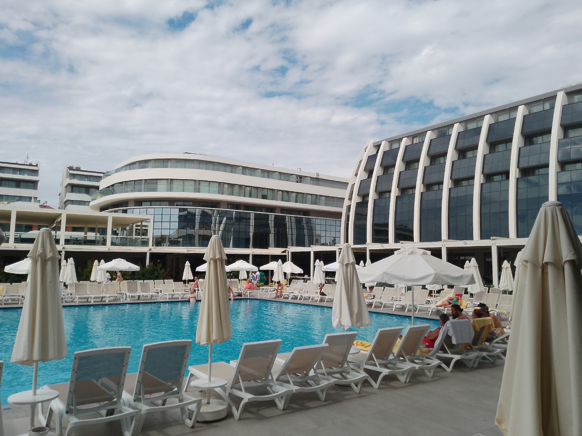 Сегодня я хочу рассказать про отель 5 звезд, который находится в Сиде, провинция Чолаклы. Давайте вместе с вами прогуляемся по его территории посмотрим, как все устроено. Рядом с корпусом отеля находится большой бассейн, вокруг расположено огромное количество лежаков для отдыхающих. Наш номер, он двухкомнатный. Он находится на первом этаже отеля, есть балкончик. Балкон нашего номера с видом на бассейн. С другой стороны отеля на первом этаже расположены ещё более интересные номера. Здесь предусмотрен собственный выход прямо из номера в бассейн. Выйдя из номера сразу можно устроиться загорать на собственных лежаках и если есть желание поплавать в бассейне, он кстати индивидуальный только для гостей этих номеров, остальных туда не пускают. На территории отеля находятся два больших бассейна, один из которых принадлежит отелю Victory Be Mine 5*, это одна сеть отелей Victory, и отдыхающие могут пользоваться всей инфраструктурой, барами, ресторанами обоих отелей. На одном из них