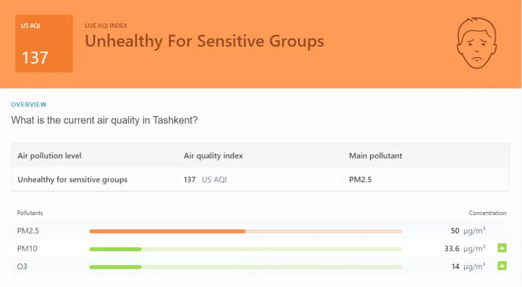 По состоянию на утро 25 сентября 2024 года, индекс качества воздуха AQI (индекс по шкале США) достиг уровня 137, что классифицируется как «вредно». Основной загрязнитель — мелкодисперсные частицы PM2.5, концентрация которых составляет 79 мкг/м³, что превышает рекомендованное Всемирной организацией здравоохранения (ВОЗ) среднегодовое значение более чем в 10 раз. PM2.5 — это частицы диаметром менее 2.5 микрон, которые могут проникать глубоко в лёгкие и попадать в кровеносную систему, вызывая серьёзные проблемы со здоровьем. Длительное воздействие таких уровней загрязнения может привести к увеличению риска заболеваний сердечно-сосудистой системы, респираторных заболеваний и даже преждевременной смертности.