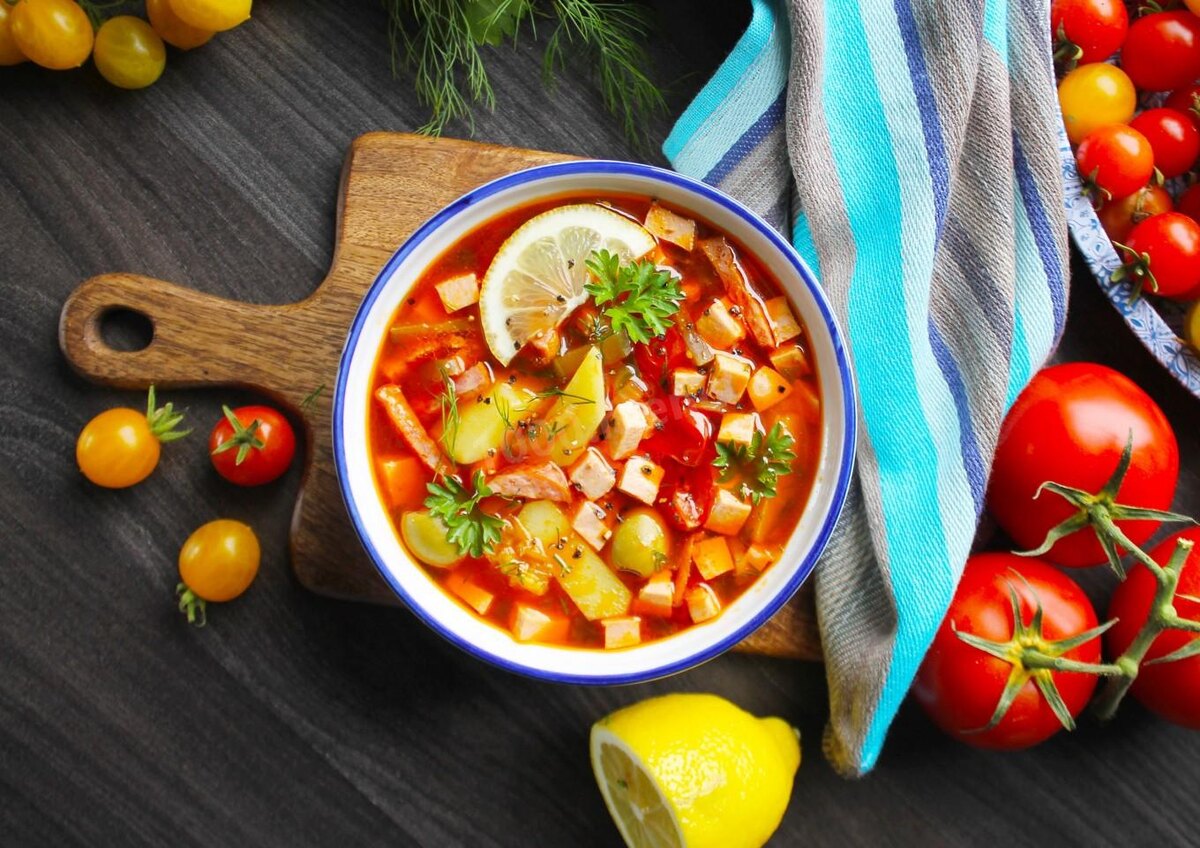 Изумительный, яркий, самый вкусный, на все случаи жизни! Суп солянка с оливками, колбасой лимоном и огурцами, сытный и наваристый, понравится всем без исключения. Если вы хотите получить более лёгкий вариант, то исключите картофель. Со сметаной или без - это идеальное лакомство для любителей первых блюд! Бульон (или вода) 2л. Вареная колбаса 200 гр Копченая колбаса 200 гр Бекон (или грудинка) 200 гр Картошка 5 шт. Лук 1 шт. Морковь 1 шт. Маринованные огурцы (или солёные) 3 шт. Томатная паста 2 столовой ложки Чеснок 2 зубчика Оливки (по вкусу) 15 шт. Лимоны 1 шт. Помидоры черри (по желанию) 5 шт. Зелень по вкусу Общее время приготовления: 40 мин ШАГ 1: Как сварить суп солянку с оливками, огурцами, колбасой и лимоном? Подготовьте все продукты, которые указаны в рецепте. Чем разнообразнее будет набор колбас, тем вкуснее и насыщеннее получится суп. ШАГ 2: Картофель, лук и морковь очистите от кожуры, ополосните в чистой холодной воде и обсушите бумажными салфетками. ШАГ 3: Картошку нарежьте