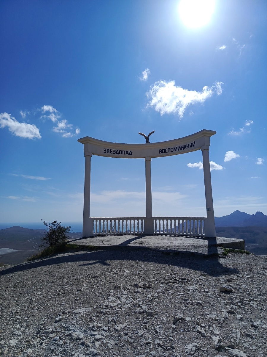 Смотровая площадка и беседка "Звездопад воспоминаний" устроена между Феодосией и Коктебелем на горе Коклюк. Виды с этого места, в какую сторону ни глянь, какие-то инопланетные, надмирные. Невольно "зависаешь" и с трудом возвращаешь себя из воронки зрелища. Амеретская долина; непонятно откуда появляющееся соленое озеро Бараколь, пересохшее сейчас; впадины, холмы... Рельеф с высоты просто околдовывает!