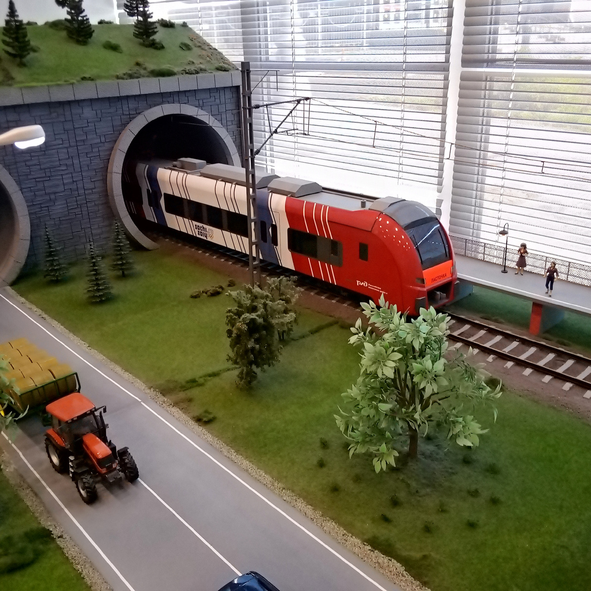 Всех приветствую! В сегодняшней статье фото макетов подвижного состава из музея на Рижском вокзале. На первом фото мини-диорамка в каком-то крупном масштабе. Далее идут витрины с моделями, первая с моделями современных эл. поездов: