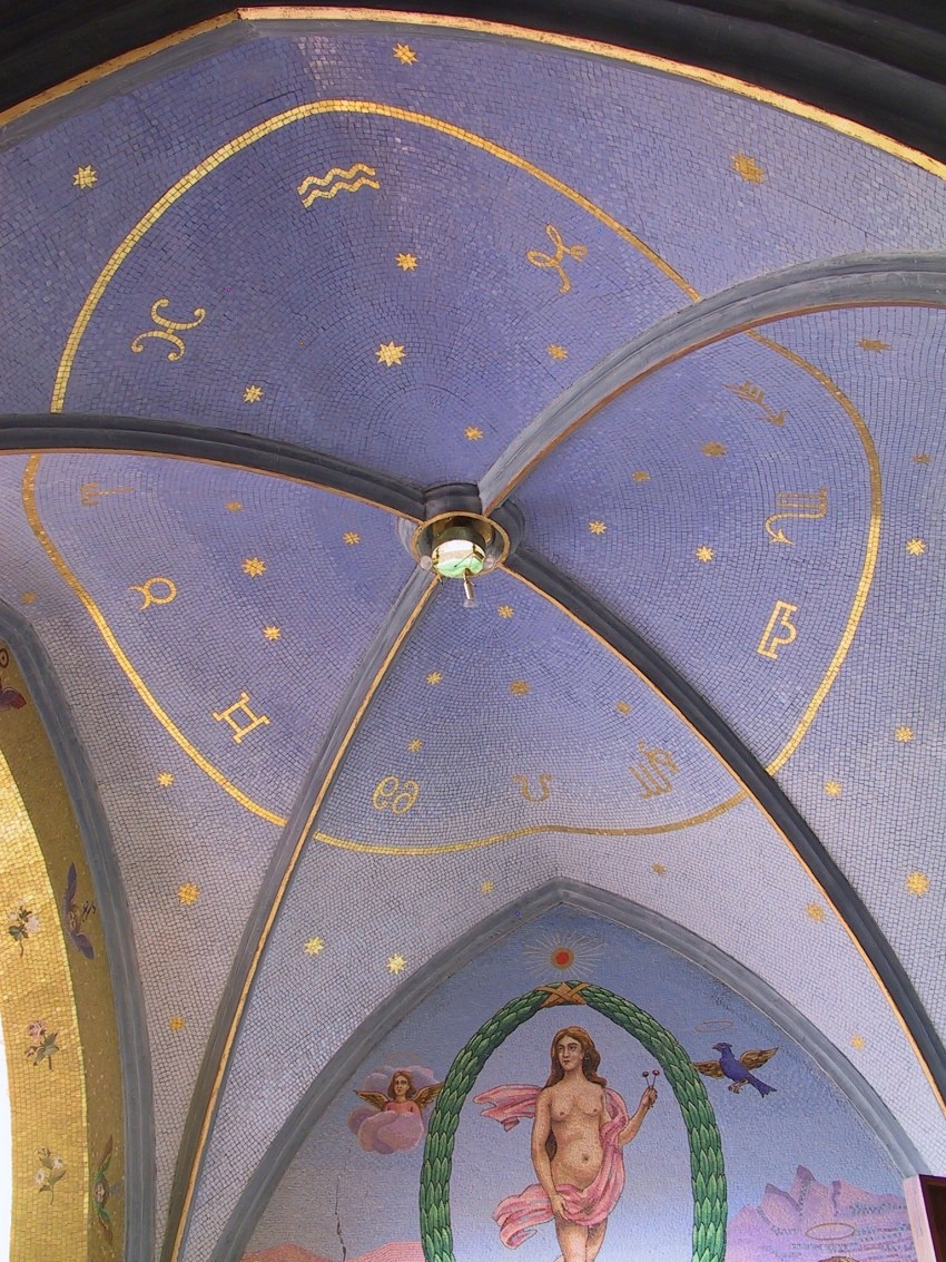 На границе Франции и Швейцарии, у подножья Альп, находится замок, к которому прилегает Голубая часовня. Тем, кому нравится тема Таро, точно должно понравиться такое... На территории замка можно встретить сфинксов, мифологических персонажей, многочисленные гроты и подземные бассейны. Но самой мистической и в то же время великолепной частью всего ансамбля всё же является часовня, стены которой покрыты мозаичными Картами Таро в традициях Марсельского. Изображённые персонажи носят одежду, чем-то похожую на древнеперсидскую или древнеегипетскую. Каждая «Карта» пронумерована, там же нарисована еврейская буква. Вся плитка выполнена из эмали и золотой мозаики. Потолок тоже покрыт голубой, инкрустированной золотом, мозаикой, где можно увидеть все двенадцать знаков Зодиака. Давайте просто полюбуемся. Листайте галерею ниже: А это фото часовни в развёртке. На него можно нажать, чтобы рассмотреть поподробнее. Кстати, сейчас этот замок является отелем, куда может попасть любой желающий (если есть фи